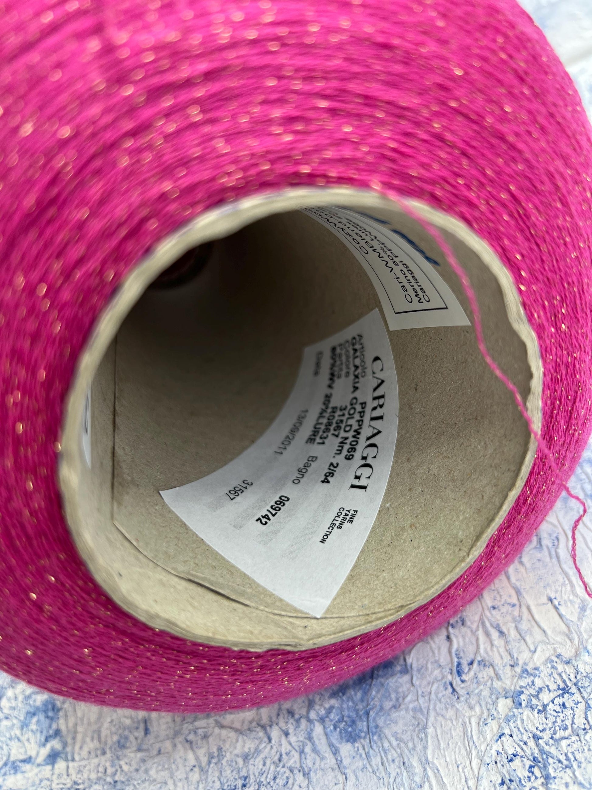Merino yarn 80%, Lurex yarn 20%, Galaxia Gold Cariaggi, Color Fuxia. Per 100 gr